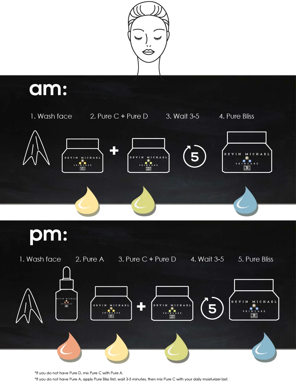 The Devin Michael skincare philosophy is simple and holistic. Natural products and a healthy lifestyle will keep your skin looking its best. We believe that topical agents are as important as what you eat. While educating yourself as to what is best for your body can be a lifelong process, keeping your skin youthful doesn't have to be. We know what your skin needs to function at its best, and we've put it in our four products Pure A, Pure Bliss, Pure C and Pure D with consistent and regular use you can expect to see your skin's natural radiance and vitality restored.